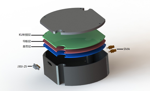 终端由基带层、导航层、射频层三块功能性板卡组成,安装在适配于无人飞行器的结构壳体中,对外有低频数据接口、高频信号接口、同步时钟接口等,结构紧凑。