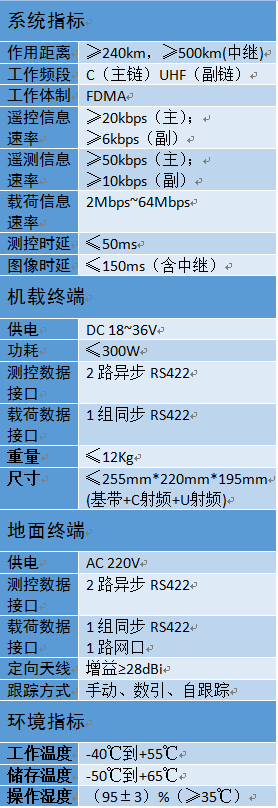 该系列产品可应用于中程无人飞行器,采用主链、副链可靠性设计,实现遥测、遥控、侦察等信息的实时通信,具备中继功能。产品由机载终端、地面终端及配套线缆组成。